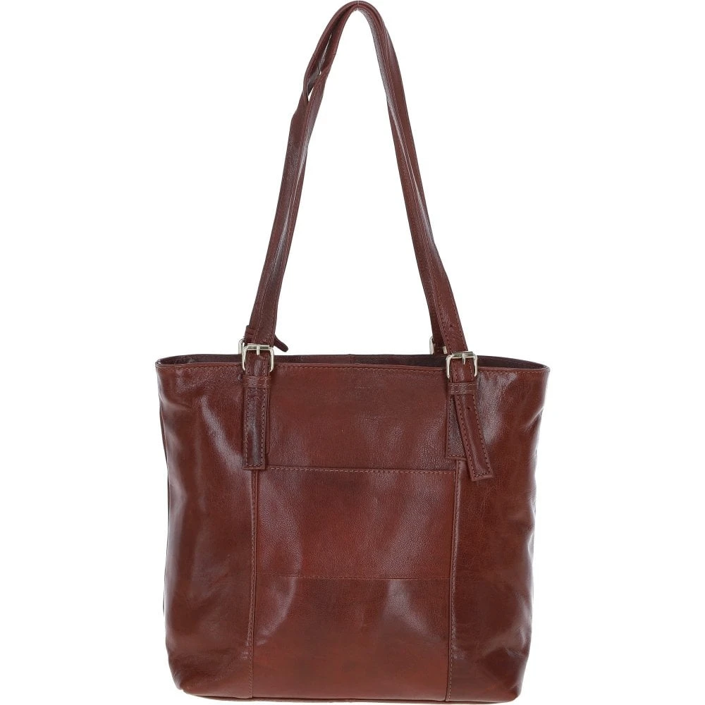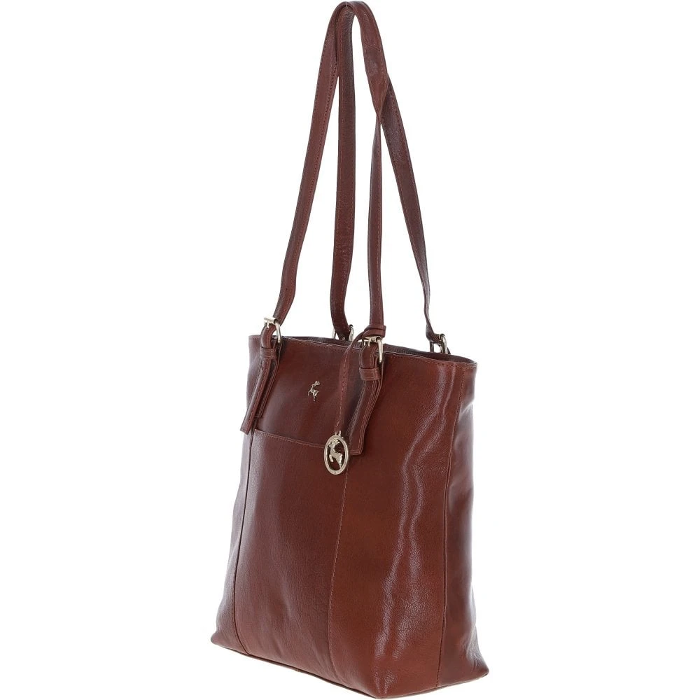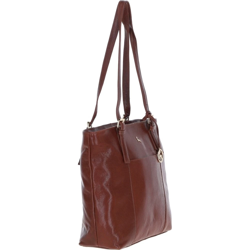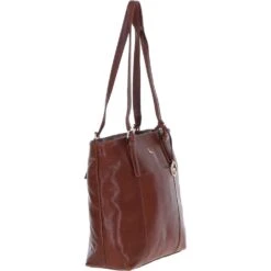 This cognac leather tote blends style and functionality with a spacious interior, multiple pockets, and durable double straps for comfortable wear. Accented with gold hardware, a top zip closure, and a decorative logo emblem, it’s ideal for work or everyday use.