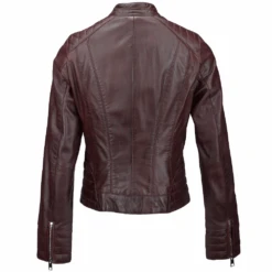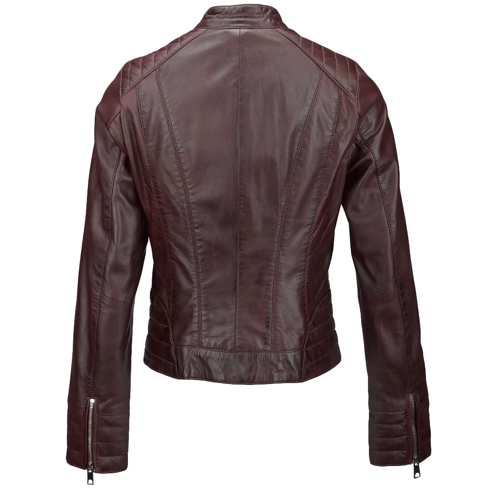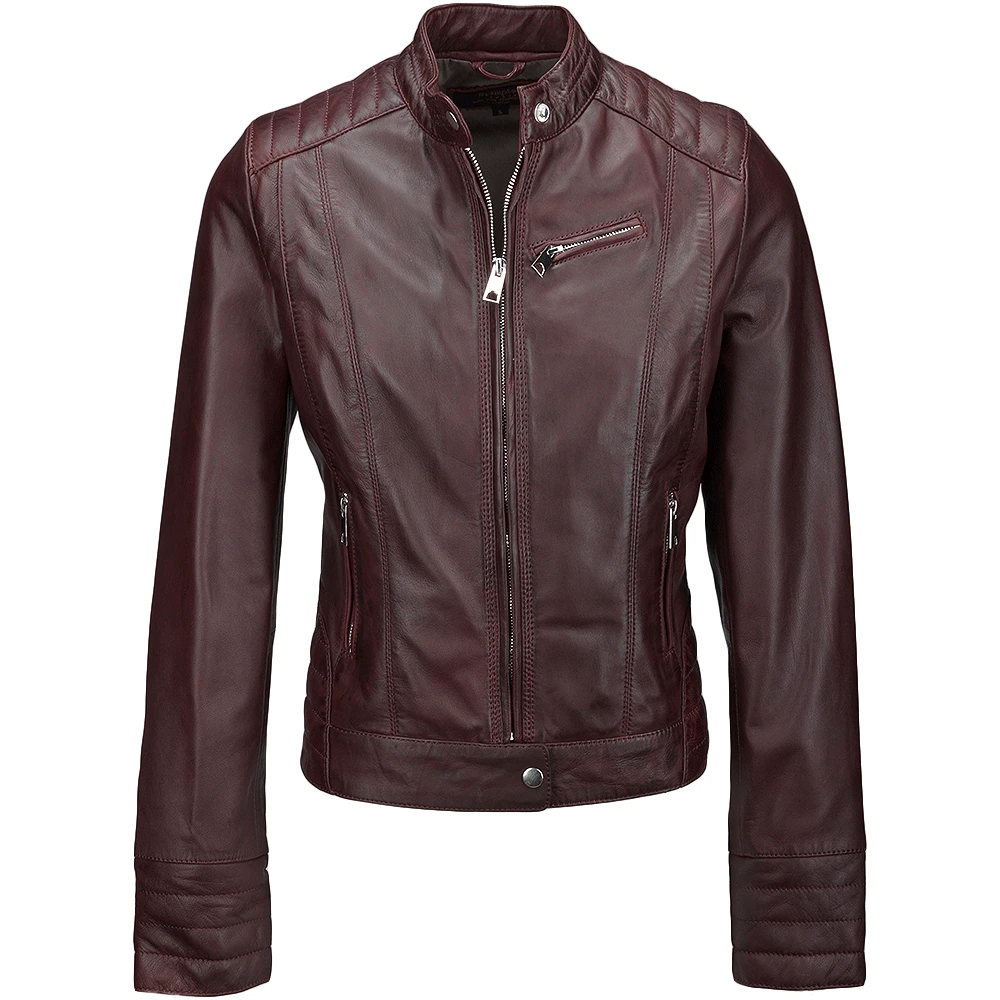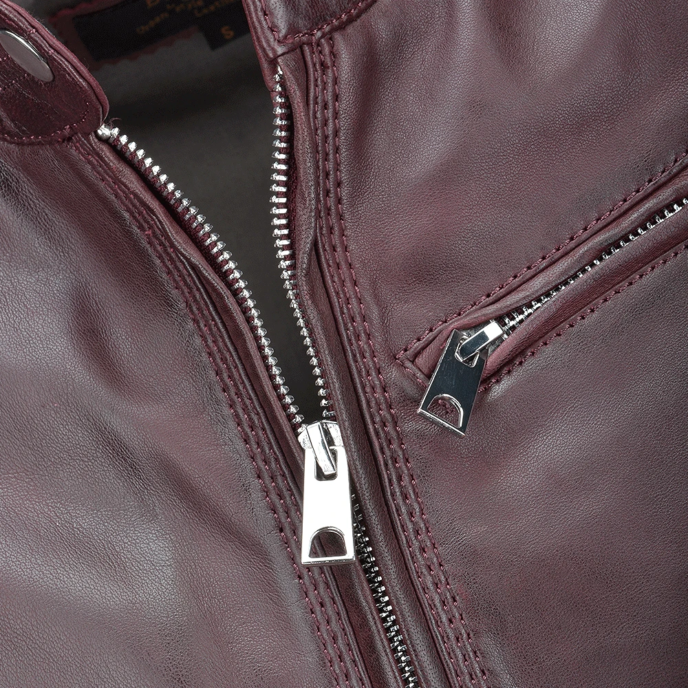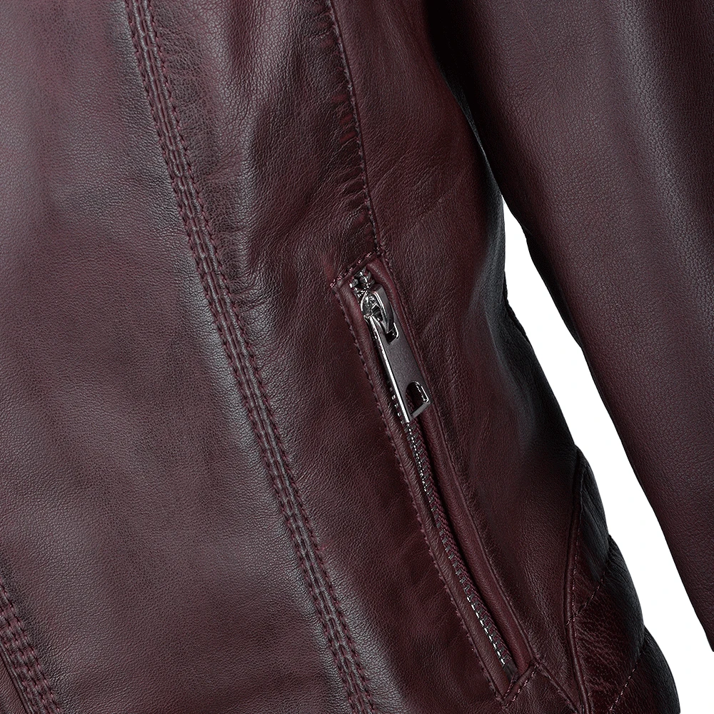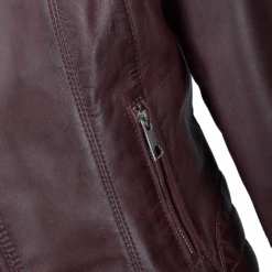 This ladies biker style enhances the idea of rebellion and adventure. With modern fashion detail, classic biker stitch detailing, classic sleeves with biker zips. Crafted from quality nappa sheeps leather. Coloured in burgundy with a vintage wash and finished with a hand waxed effect.