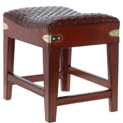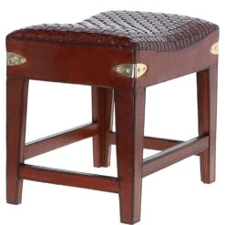 Leather Covered Wood Frame Vintage Woven Leather Stool Chestnut: LF-143