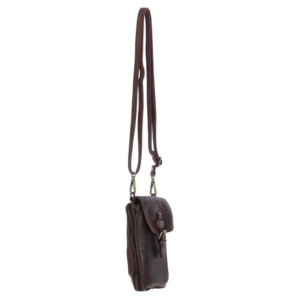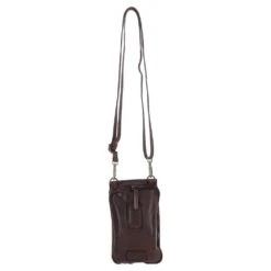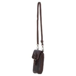 The bag’s main compartment is designed to secure your smartphone, while the additional front pocket with a snap closure provides easy access to essential cards, cash, or headphones. Vintage Brass-tone hardware complements the leather, adding a touch of elegance and ensuring secure closure and attachment of the strap.