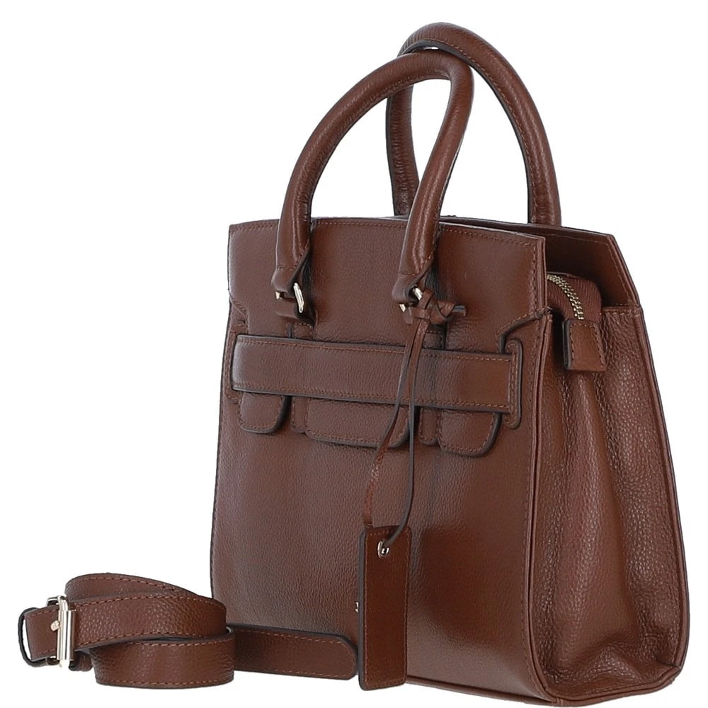 This elegant ladies leather handbag combines style and practicality. Made from premium real leather, it features a zip closure, gold-colored hardware, and a detachable 60 cm crossbody strap. The interior includes 3 pockets, 1 external pocket, and an internal compartment for organized storage.