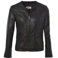 Leather craftsmanship at its best the collarless leather jacket from Ashwoods design team with the choice of the smooth black finish or the vintage wash and hand waxed effect in the tan or brown. Clean lines, attention to detail zig zag styling running along the front and around base of the neckline. Beautifully crafted leather, structured and elegant cut.