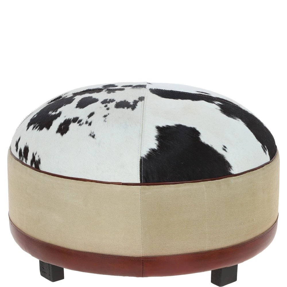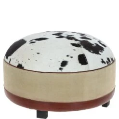 Elevate your home décor with our Ashwood Leather Footrest/Stool featuring a stylish cowhide pattern. This versatile piece combines luxurious leather, durable beige fabric, and a sturdy wooden base, perfect for adding a touch of elegance to any room. Ideal for living rooms, bedrooms, or offices.