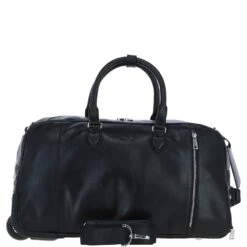 This luxurious leather wheeled duffle bag combines elegance and functionality, perfect for weekend getaways or business travel. Crafted from premium leather, it features a spacious main compartment, a sturdy telescopic handle, and smooth-rolling wheels for easy mobility. The bag is adorned with silver-coloured hardware, adding a sophisticated touch to its design. It also includes an external zip compartment for quick access and secure storage.