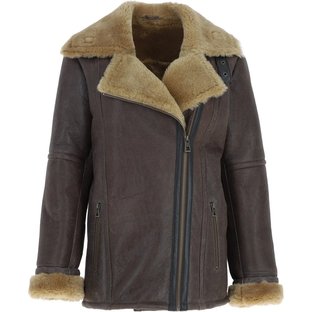 Crafted from premium sheepskin with sleek leather-bound edges, this aviator jacket combines a generous, flattering fit with classic biker-inspired details. It features an asymmetric brass zip closure and an adjustable collar for versatile styling. Lightweight and plush, it regulates temperature naturally for year-round comfort.