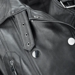 Handcrafted modern short black biker in a beautiful vegetable tanned eco friendly leather. With its simple clean lines, biker detailing, timeless styling, complete with a hand rubbed finish. Expect a side zip fastening, two functional zip pockets, biker detailing epaulettes to the shoulder and buckle and belt to neck and cuffs.