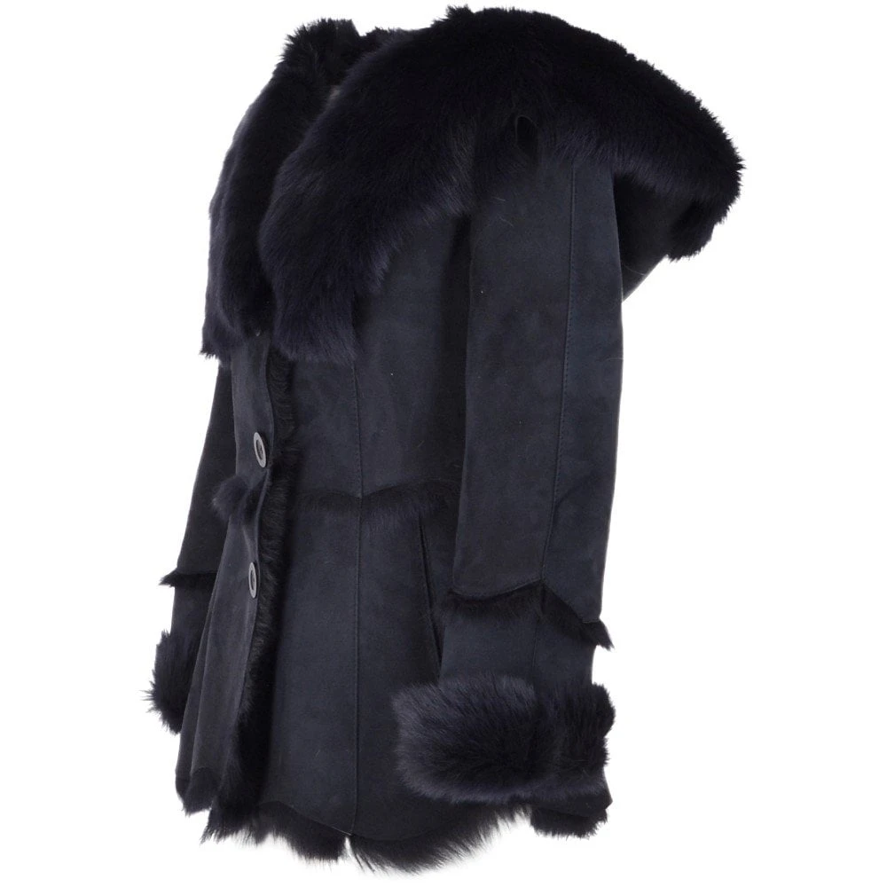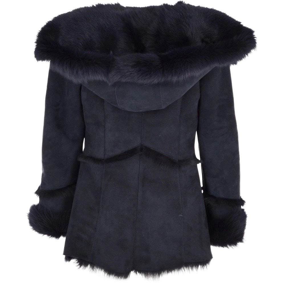 This luxury toscana sheepskin shearling coat boasts large lapels which merge on to a large fur hood which ensures absolute warmth, Muna is beautifully designed and handcrafted. Luxuriously finished in a beautiful hand buffed outer shell to give a soft indulgent suede feel using traditional leather artisan methods.