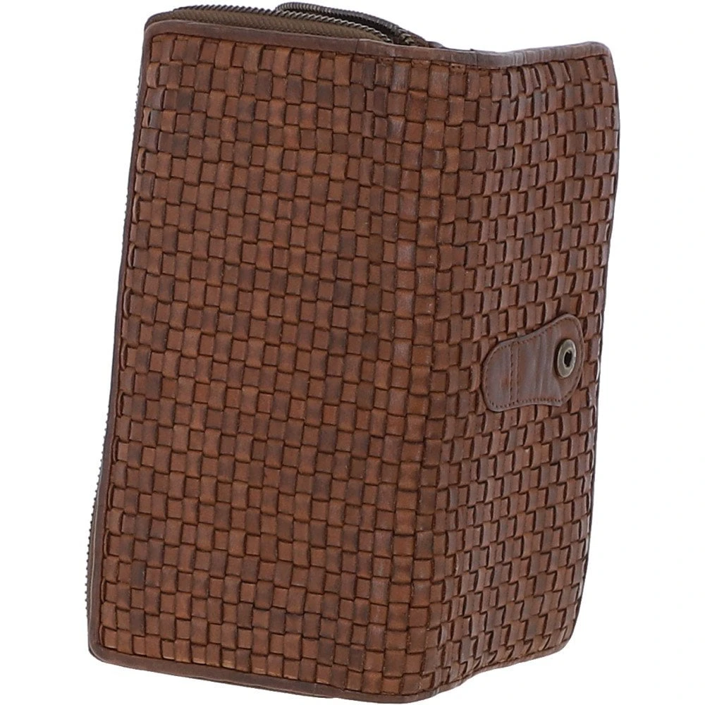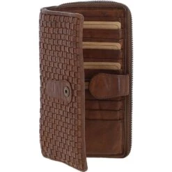 A luxurious vintage wash 22 card purse with a new refined shape. Expect a woven leather detailed front. Open to find spacious inner compartments to hold cards, notes and coins.