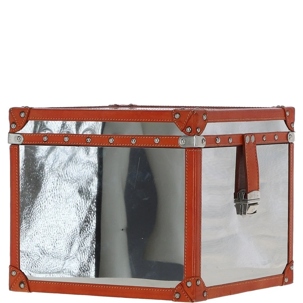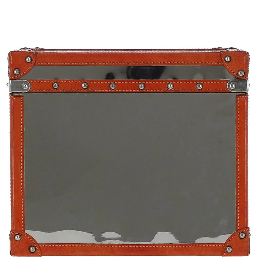 Wood and Aluminium Mirror Storage Box with Tan Leather Trim and Stud Detailing: AGC 918